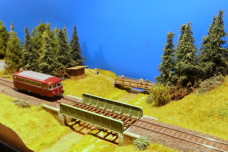 Die Gleishöhe (SO) über Fußboden ist 124cm (+/- 2cm). Verwendetes Gleismaterial ist RocoLine ohne Bettung. Die 15°-Weichen im sichtbaren Bereich wurden auf einen Abzweigwinkel von 11° umgebaut. Gefahren wird DCanalog oder Digital DCC. Weichen und Gleisabschnitte werden über den von mir entwickelten SSB64 geschaltet und per PC bedient.